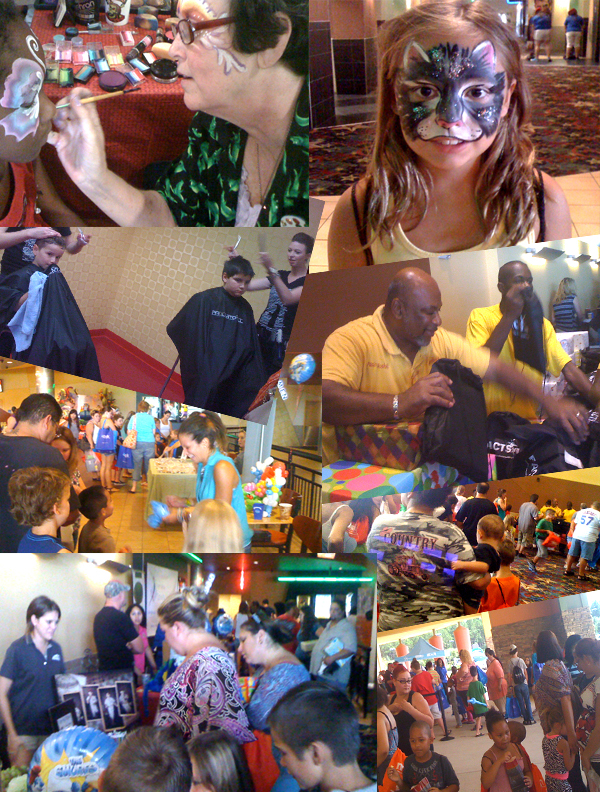 The Cobb Theatre at Wesley Chapel, Florida held a special Back to School event with free school supplies, games, face painting, medical screenings, tutoring information, healthy eating suggestions, dental hygiene tips, child safety kits and yes even hair-cuts and more. The turn out was in the hundreds with everyone having a chance to visit the exhibitors and enjoy the bounce houses and fun area.