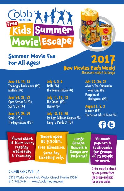 The Cobb Theatre in Wesley Chapel, Florida presents their annual FREE Kids Summer Movies