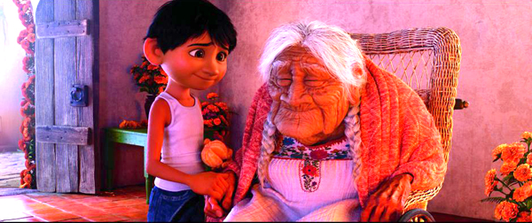There’s a new princess Coco on Disney’s list, or maybe she’s a queen, but certainly a matriarch. Her name is Mama Coco (voice of Ana Ofelia Murguia) and she’s the great grandmother of a boy named Miguel (voice of Anthony Gonzalez). Quite talented Miguel wants to be a great singer and guitar player like the greatest ever Ernesto de la Cruz (voice of Benjamin Bratt). In a small space in the attic with the street dog Dante, Miguel practices in secret in front of a shrine he has made to the famous musician.