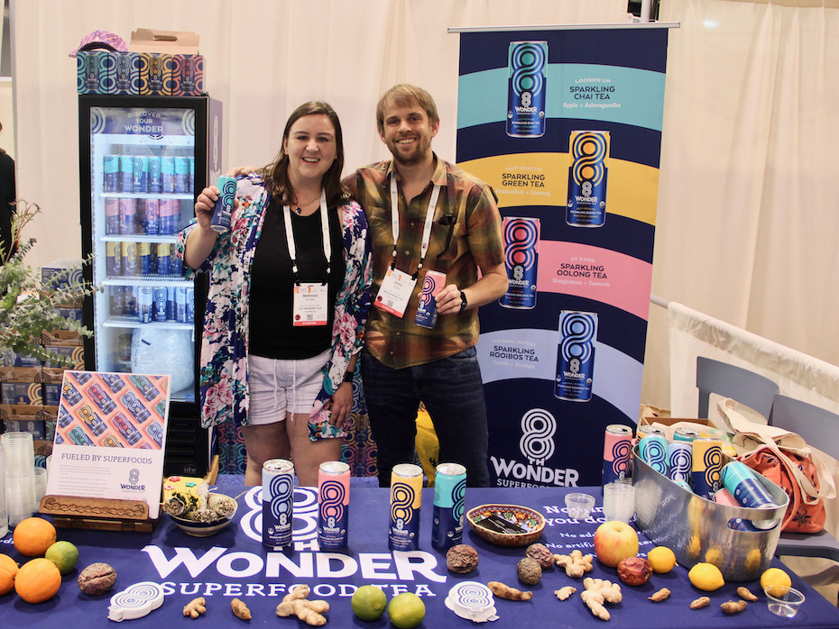 Marissa and Reed showcasing 8th Wonder Sparkling Teas packed with vitamin C, antioxidants, and no added sugar for increased mental energy and acuity.