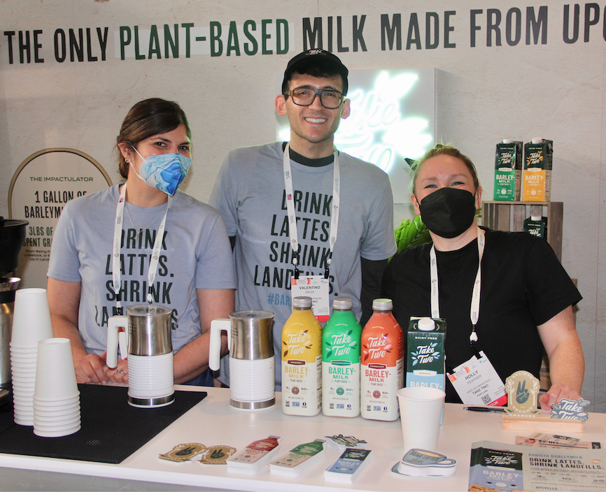 Holly, Valentiso, and Jennifer showcasing Take-Two Plant-Based Barley Milk made from upcycled Barley.