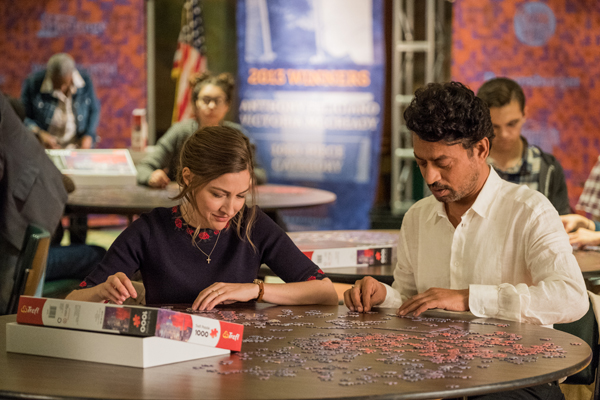 The next day, after getting everyone going their separate ways, she opens the puzzle box and dumps out all of the 1000 pieces on the kitchen table. Within a few hours she has completed the map of the world in glorious color. Proud at what she has done she visits a game shop in New York and picks out another puzzle. On the way out of the shop she sees a sign posted by a man named Robert (Irrfan Khan) looking for a puzzle partner to enter a competition.