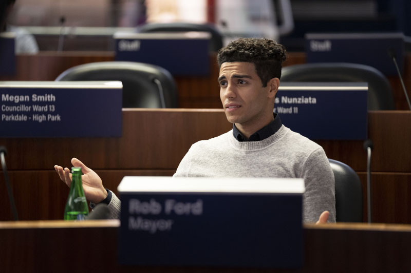 The film follows several recent college grads that are seeking jobs. Bram (Ben Platt) applies at The Record a thriving newspaper, Kamal (Mena Massoud) gets a cherry job working for Bob Ford (Damian Lewis) the mayor, and Ashley (Nina Dobrev ) gets a job at City Hall. She even works with Kamal helping with the mayor’s appointments and duties. The three as well as other fellow student’s lives become entwined with Bram delving into Mayor Ford’s possible scandal. It’s a classic climbing the ladder to success with some rungs missing.