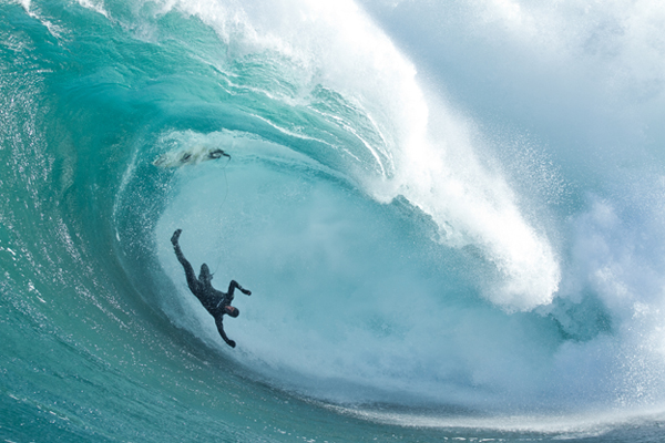 The risk factor is high with nearby rocks rising from the ocean floor like skyscrapers. Defying the ocean’s currents, rising waters and coral bottoms the two men put themselves in peril just for the short thrills that would easily kill even the most experienced surfer. Towed with high powered jet skis to the top of the crest, the men drop the tips of their boards and fly down mammoth waves toward the ocean floor then slide into the tunnel that could house a ship at speeds that defy the imagination.