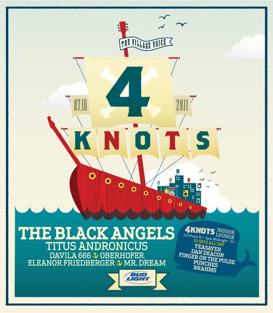 The inaugural 4Knots Music Festival will also include live music on South Street Seaport Pier 17 from 1-8pm. The Black Angels, Titus Andronicus, Davila 666, Oberhofer, Eleanor Friedberger and Mr. Dream and are all scheduled to perform on the outdoor stage at the free, all day, all ages music festival.