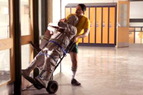 Todd108 – Atticus (Chris Leavins) wheels a statue of Curtis out the door, hoping to get the Book from it – D33_ 55